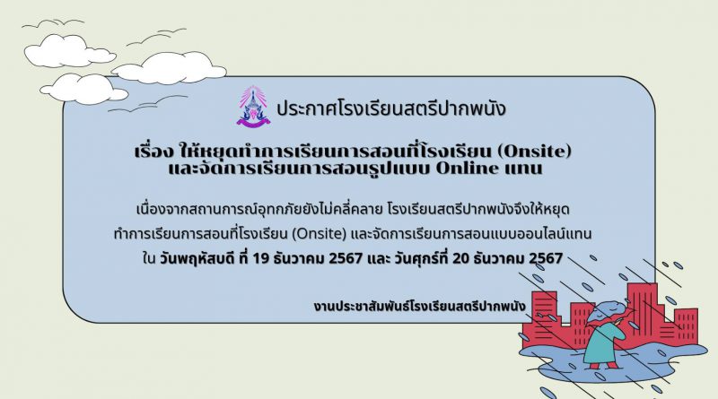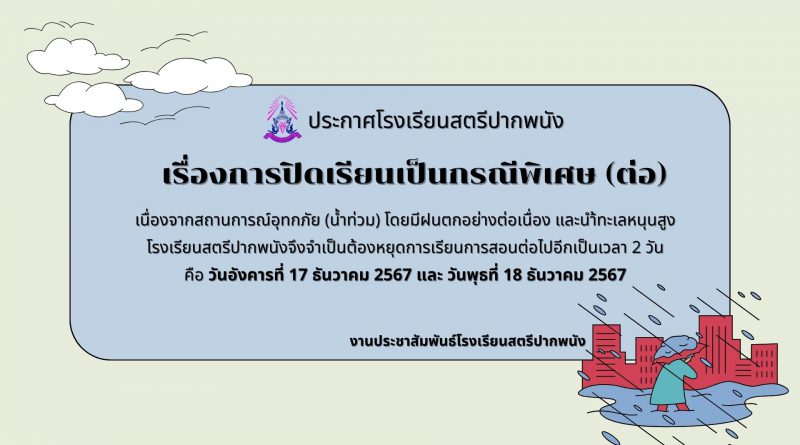 ข่าวประชาสัมพันธ์ 16 ธันวาคม 2024 ครูทิพย์สุรีย์ คงแก้ว ประกาศปิดเรียนเป็นกรณีพิเศษ เนื่องจากสถานการณ์อุทกภัยฉบับที่ 2 Read More
