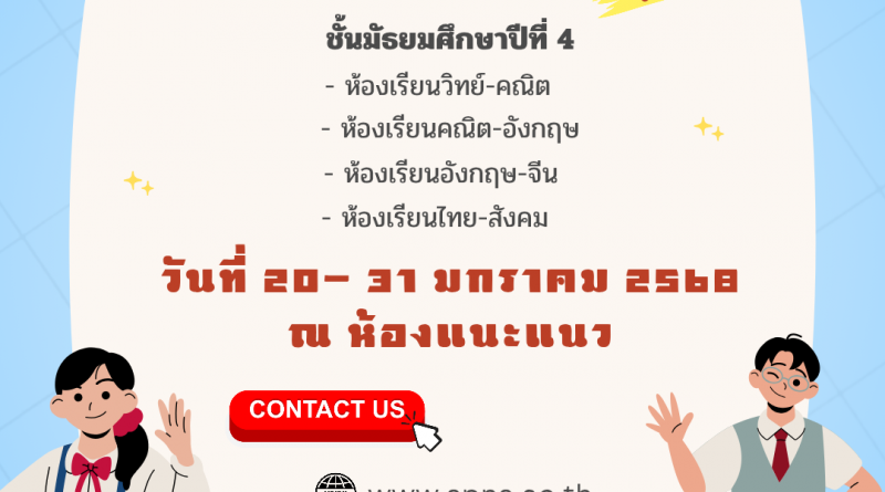 ข่าวประชาสัมพันธ์ 20 มกราคม 2025 ครูทิพย์สุรีย์ คงแก้ว รับสมัครโควต้าเข้าศึกษาระดับชั้น ม.4 Read More