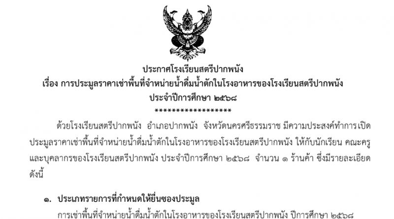 ข่าวประชาสัมพันธ์ 20 มีนาคม 2025 ครูทิพย์สุรีย์ คงแก้ว ประกาศ ประมูลราคาเช่าพื้นที่ จำหน่าย น้ำดื่มน้ำตัก ในโรงอาหาร Read More