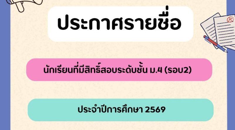 ประกาศโรงเรียน 8 เมษายน 2026 ครูทิพย์สุรีย์ คงแก้ว ประกาศรายชื่อนักเรียนที่มีสิทธิ์สอบ ม.1/2569(รอบ2) Read More