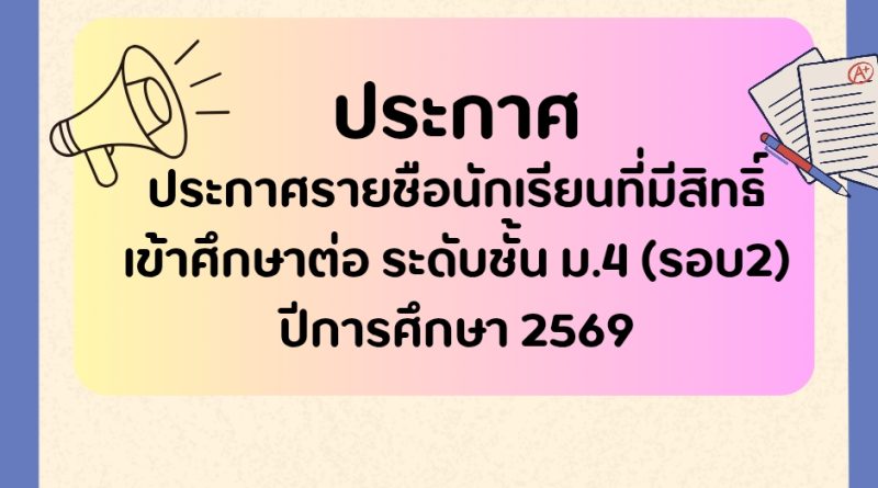 ประกาศโรงเรียน 9 เมษายน 2026 ครูทิพย์สุรีย์ คงแก้ว ประกาศรายชื่อนักเรียนที่มีสิทธิ์เข้าศึกษาต่อระดับชั้น ม.4/2569 (รอบ2) Read More