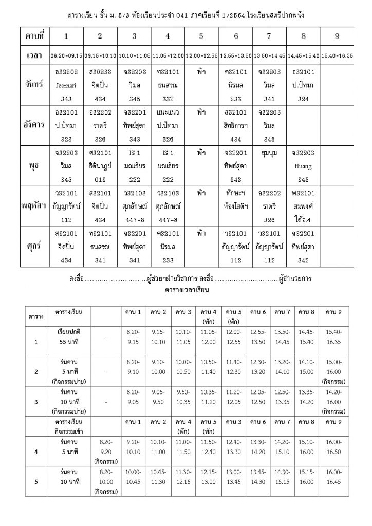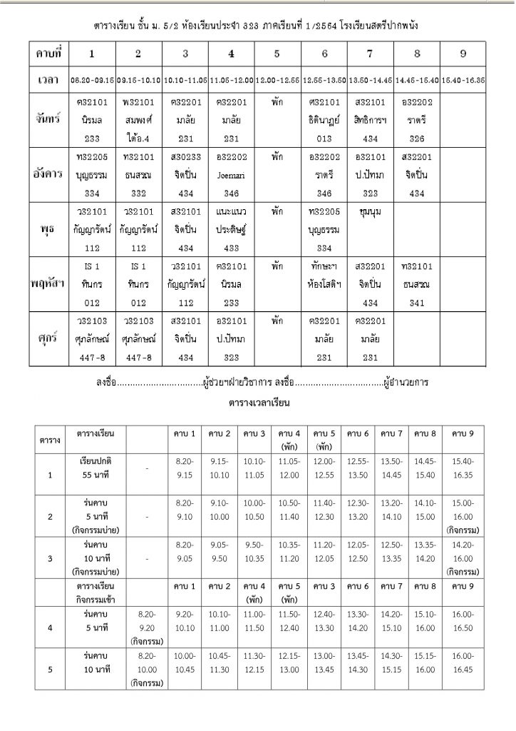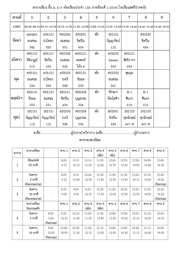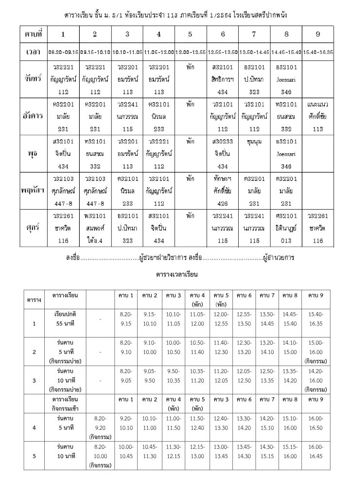 ตารางเรียน ตารางเรียนโรงเรียนสตรีปากพนัง ปีการศึกษาที่ 1 / 2564 (ม.5) 3 มิถุนายน 2021 คุณวุฒิ สุขพิทักษ์