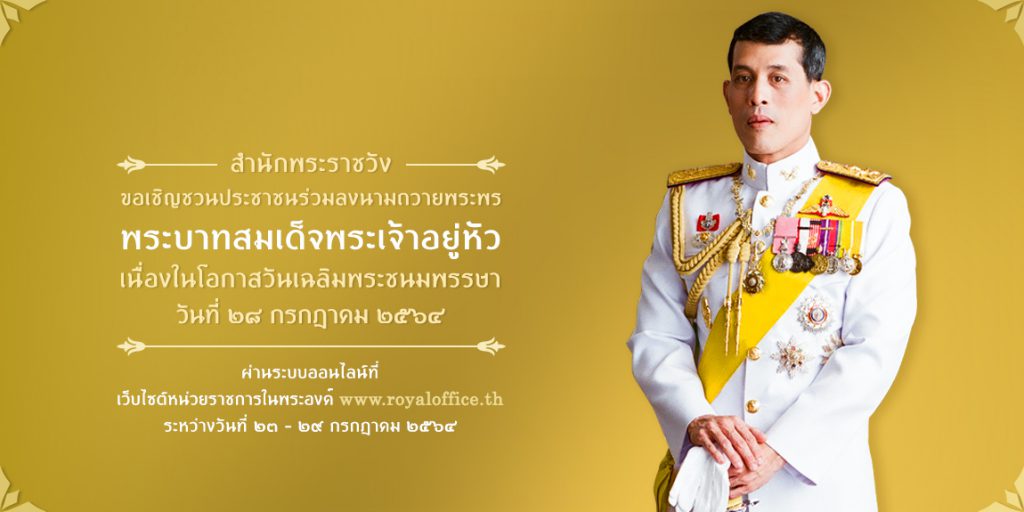 สำนักพระราชวัง ขอเชิญชวนประชาชนร่วมลงนามถวายพระพร พระบาทสมเด็จพระเจ้าอยู่หัว เนื่องในโอกาสวันเฉลิมพระชนมพรรษา วันที่ ๒๘ กรกฎาคม ๒๕๖๔ ผ่านระบบออนไลน์