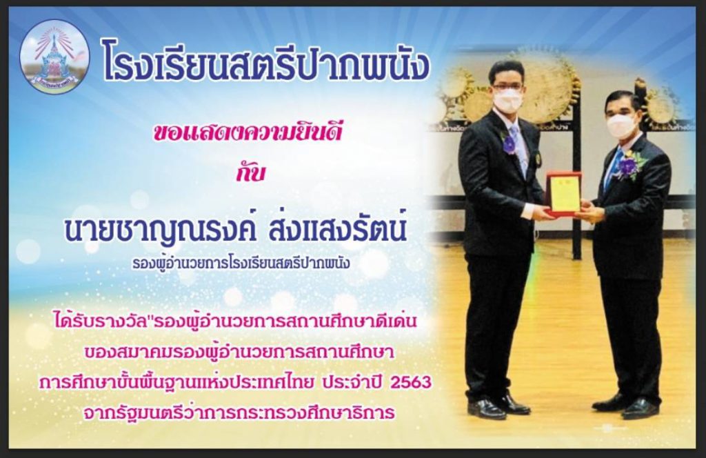 ขอแสดงความยินดีกับนายชาญณรงค์ ส่งแสงรัตน์ รองผู้อำนวยการโรงเรียนสตรีปากพนัง ที่ได้รับรางวัล”รองผู้อำนวยการสถานศึกษาดีเด่น ประจำปี 2563″ จากรัฐมนตรีว่าการกระทรวงศึกษาธิการ โดยว่าที่ร้อยตรี ดร.ธนุ วงษ์จินดา รองเลขาธิการคณะกรรมการการศึกษาขั้นพื้นฐาน เป็นผู้มอบ ในการประชุมสัมมนาทางวิชาการและการประชุมใหญ่สามัญประจำปี 2563 ของสมาคมรองผู้อำนวยการสถานศึกษาการศึกษาขั้นพื้นฐานแห่งประเทศไทย(8ธ.ค.64)