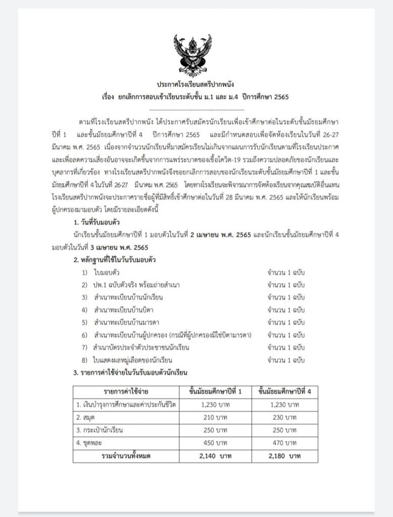 ข่าวประชาสัมพันธ์นักเรียน ม.1 และ ม.4 เข้าศึกษาใหม่โรงเรียนสตรีปากพนัง 2565 ประกาศโรงเรียนสตรีปากพนัง เรื่องยกเลิกการสอบเข้าระดับ ม.1 และ ม.4 ปีการศึกษา 2565 21 มีนาคม 2022 คุณวุฒิ สุขพิทักษ์