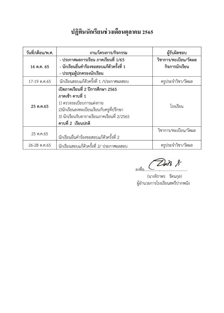 ปฏิทินนักเรียนช่วงเดือนตุลาคม 2565
