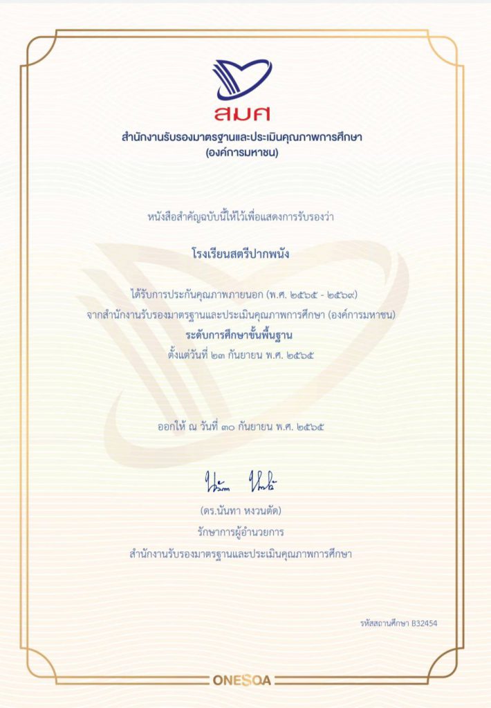 ข่าวประชาสัมพันธ์ โรงเรียนสตรีปากพนังได้รับการประกันคุณภาพภายนอก(พ.ศ. 2565 ถึง พ.ศ. 2569 จากสำนักงานรับรองมาตรฐานและประเมินคุณภาพการศึกษา (องค์การมหาชน) ระดับการศึกษาขั้นพื้นฐาน ตั้งแต่ 29 กันยายน 2565 1 พฤศจิกายน 2022 คุณวุฒิ สุขพิทักษ์