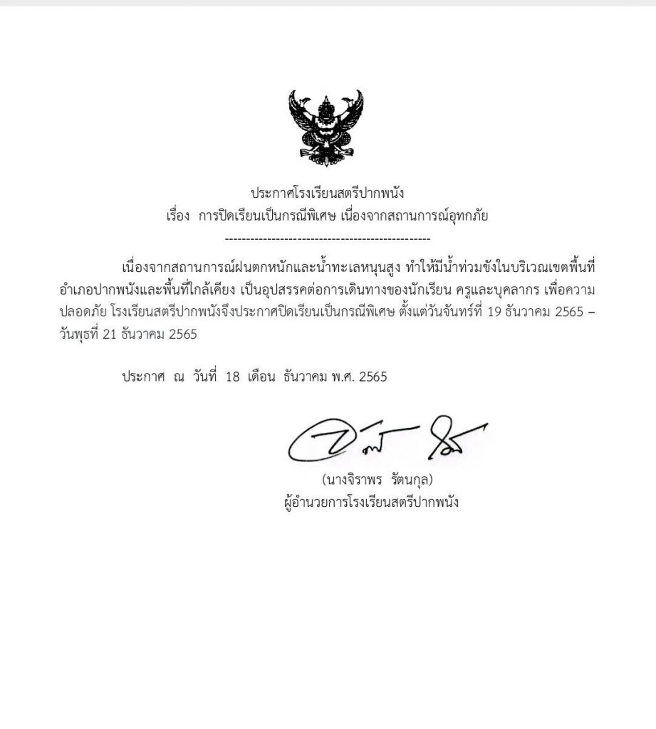 ข่าวประชาสัมพันธ์ ประกาศโรงเรียนสตรีปากพนัง เรื่องปิดการเรียนเป็นกรณีพิเศษ เนื่องจากสถานการณ์อุทกภัย 18 ธันวาคม 2022 คุณวุฒิ สุขพิทักษ์