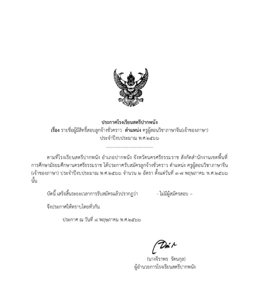 ข่าวประชาสัมพันธ์ประกาศจัดซื้อจัดจ้าง ประกาศโรงเรียนสตรีปากพนัง เรื่อง รายชื่อผู้มีสิทธิสอบลูกจ้างชั่วคราว ตำแหน่งครูผู้สอนภาษาจีน (เจ้าของภาษา) 15 พฤษภาคม 2023 คุณวุฒิ สุขพิทักษ์