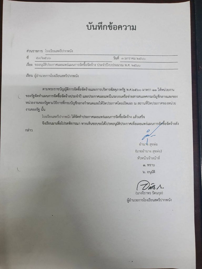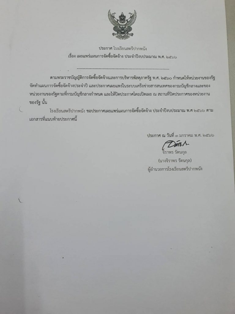 การประมูลราคาเช่าพื้นที่จำหน่ายน้ำดื่มน้ำตักในโรงอาหารของโรงเรียนสตรีปากพนังประจำปีการศึกษา ๒๕๖๙