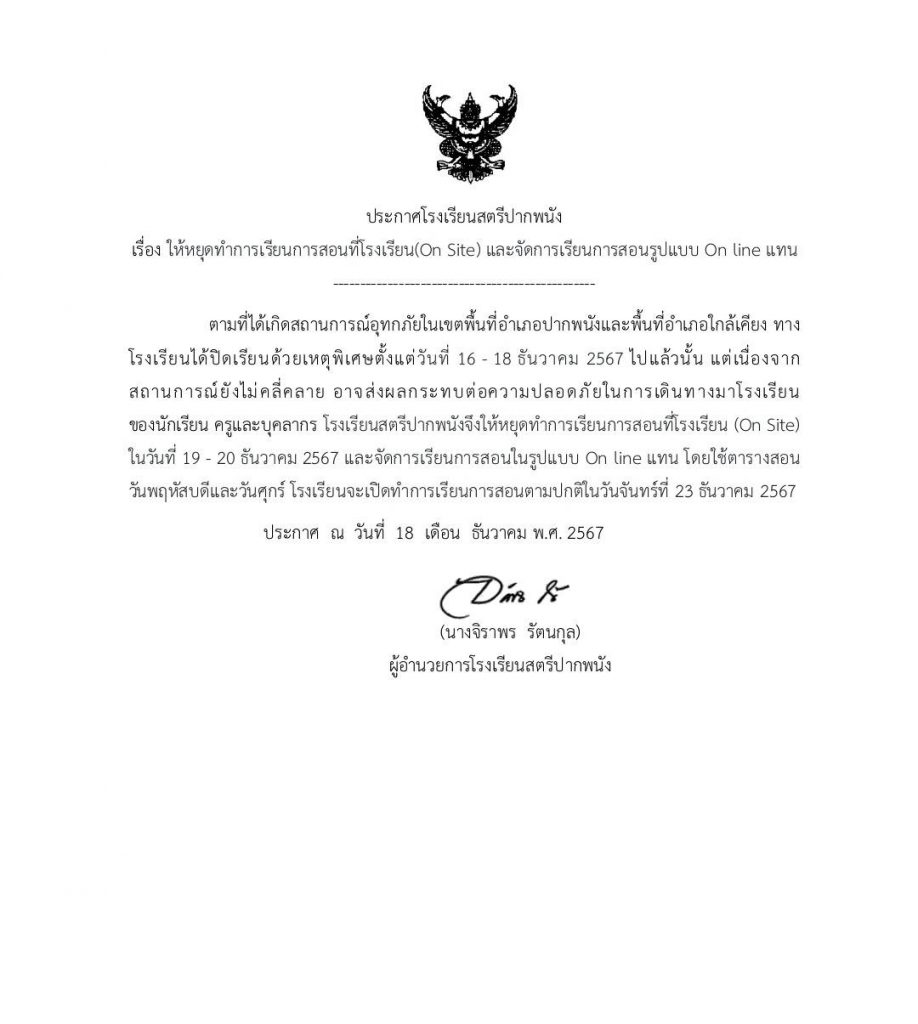 ข่าวกิจกรรม ส.ป.น.ข่าวประชาสัมพันธ์ ประกาศให้หยุดทำการเรียนการสอนแบบ Onsite และจัดการเรียนการสอนแบบ Online แทน 18 ธันวาคม 2024 ครูทิพย์สุรีย์ คงแก้ว