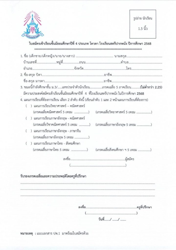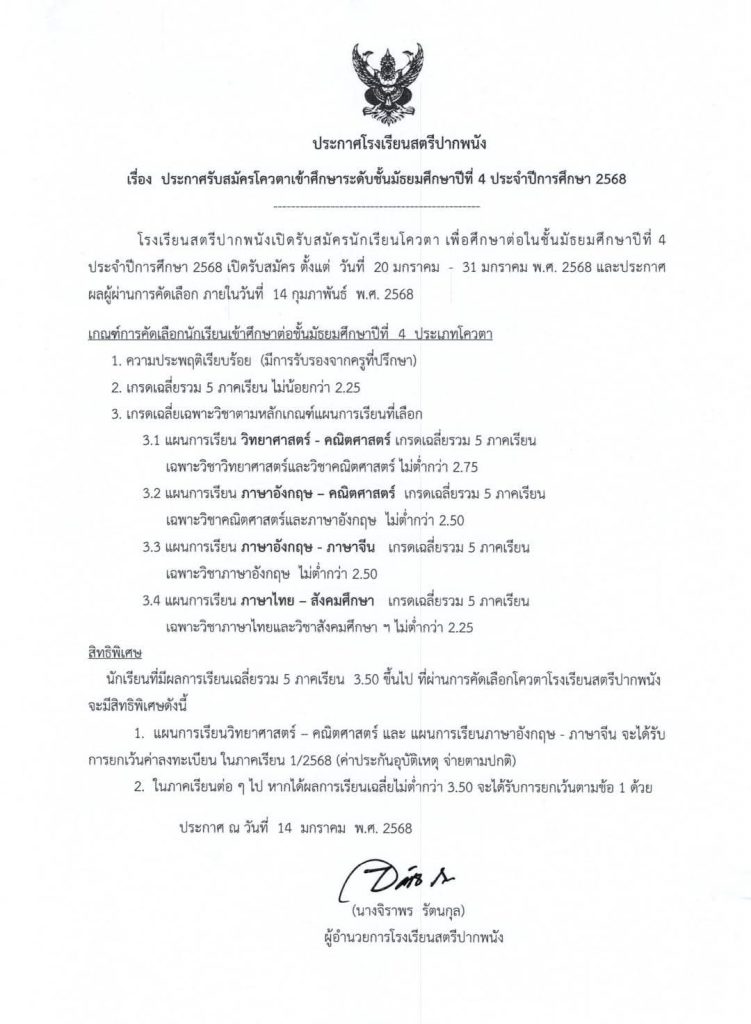 รับสมัครโควต้าเข้าศึกษาระดับชั้น ม.4
