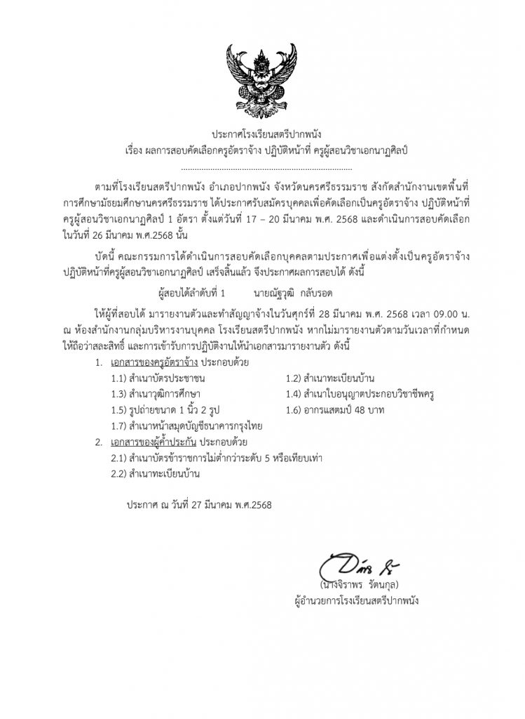 ประกาศผู้ผ่านการคัดเลือกครูนาฏศิลป์