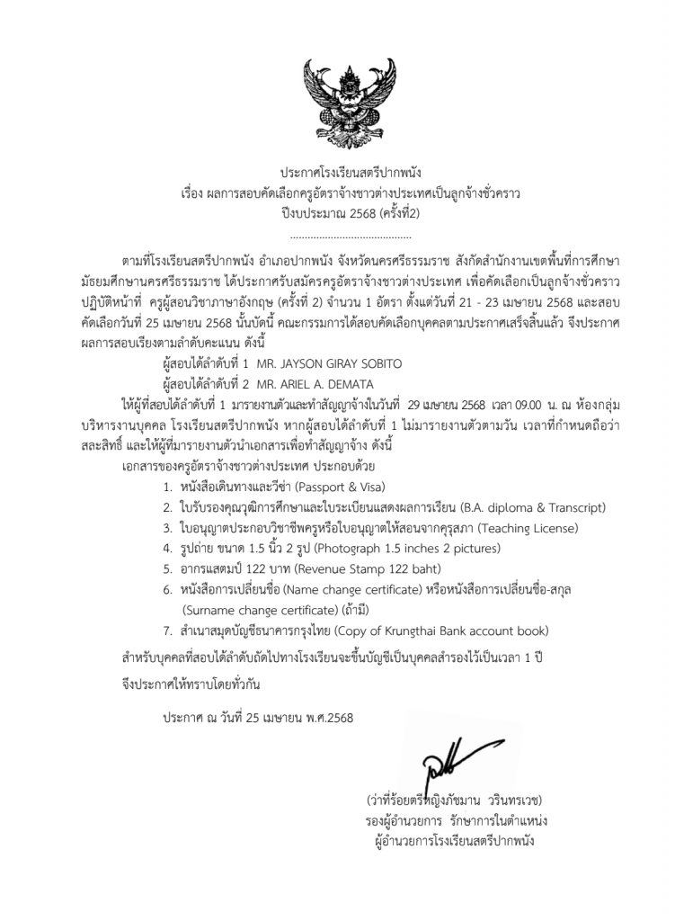 ผลการรับสมัครครูอัตราจ้างชาวต่างประเทศ