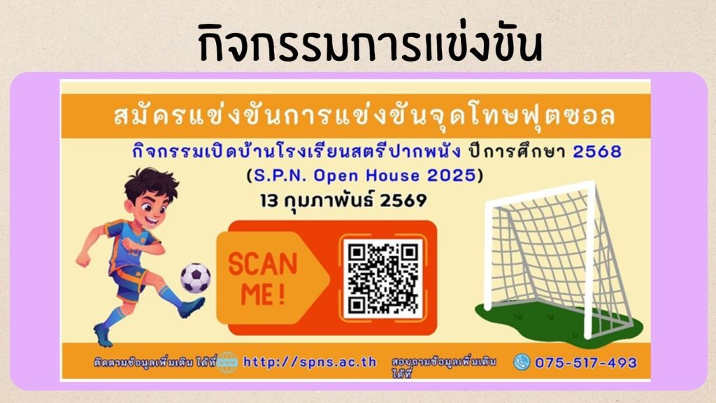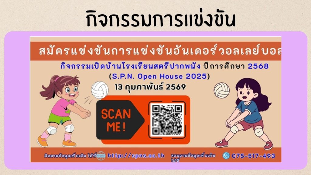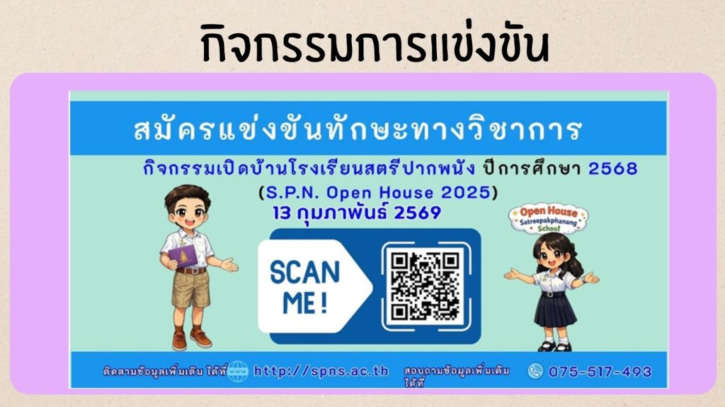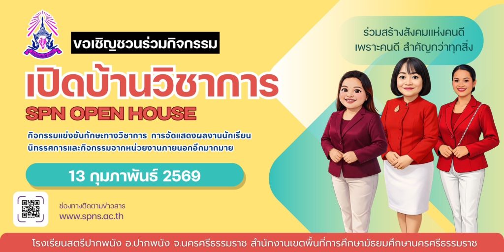 ข่าวกิจกรรม ส.ป.น.ข่าวประชาสัมพันธ์ ขอเชิญร่วมกิจกรรมวันเปิดบ้านวิชาการส.ป.น. (S.P.N.Open House) 4 กุมภาพันธ์ 2026 ครูทิพย์สุรีย์ คงแก้ว กำหนดการเปิดบ้าน2568ดาวน์โหลด ระเบียบการแข่งขันทักษะกีฬา-2568ดาวน์โหลด QRCode แข่งขันทักษะ-Open Houseดาวน์โหลด