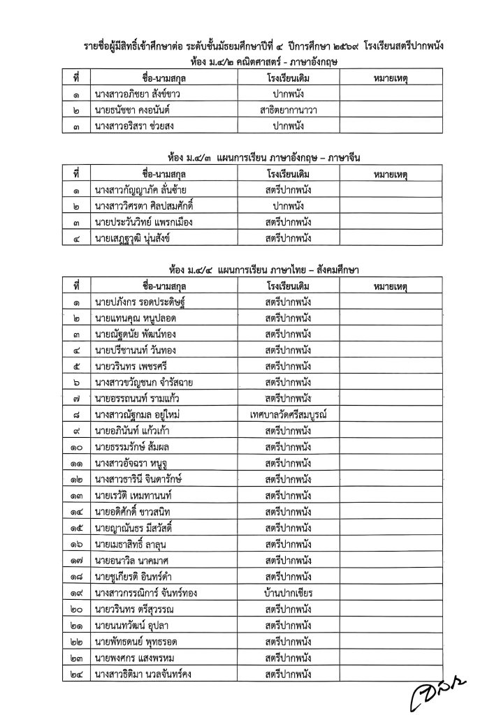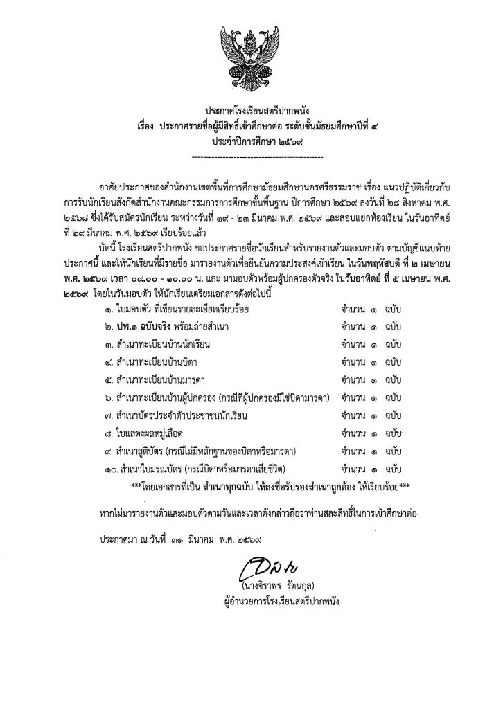 ประกาศโรงเรียน ประกาศรายชื่อผู้มีสิทธิ์เข้าศึกษาต่อ ม.4 ปีการศึกษา 2569 31 มีนาคม 2026 ครูทิพย์สุรีย์ คงแก้ว