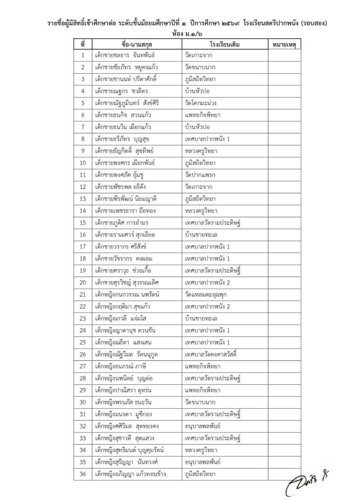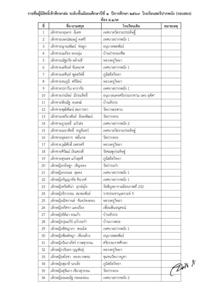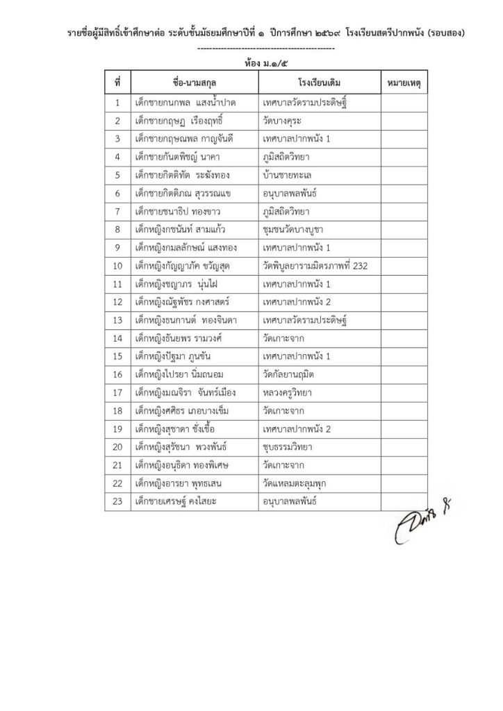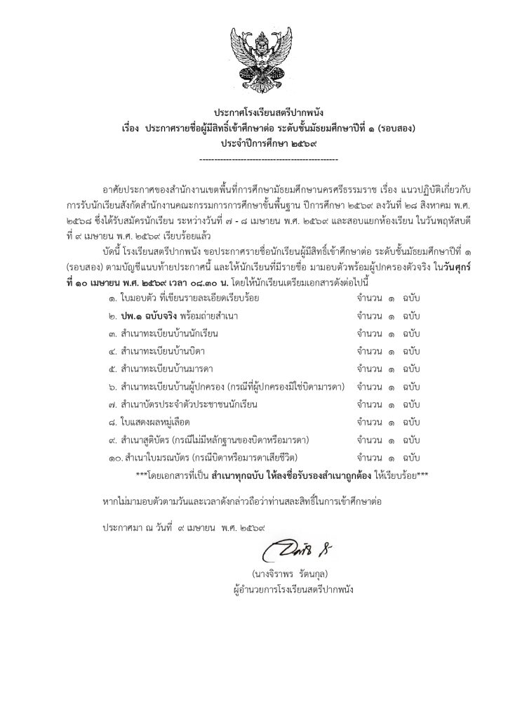 ประกาศโรงเรียน ประกาศรายชื่อนักเรียนที่มีสิทธิ์เข้าศึกษาต่อ ม.1/2569(รอบ2) 9 เมษายน 2026 ครูทิพย์สุรีย์ คงแก้ว