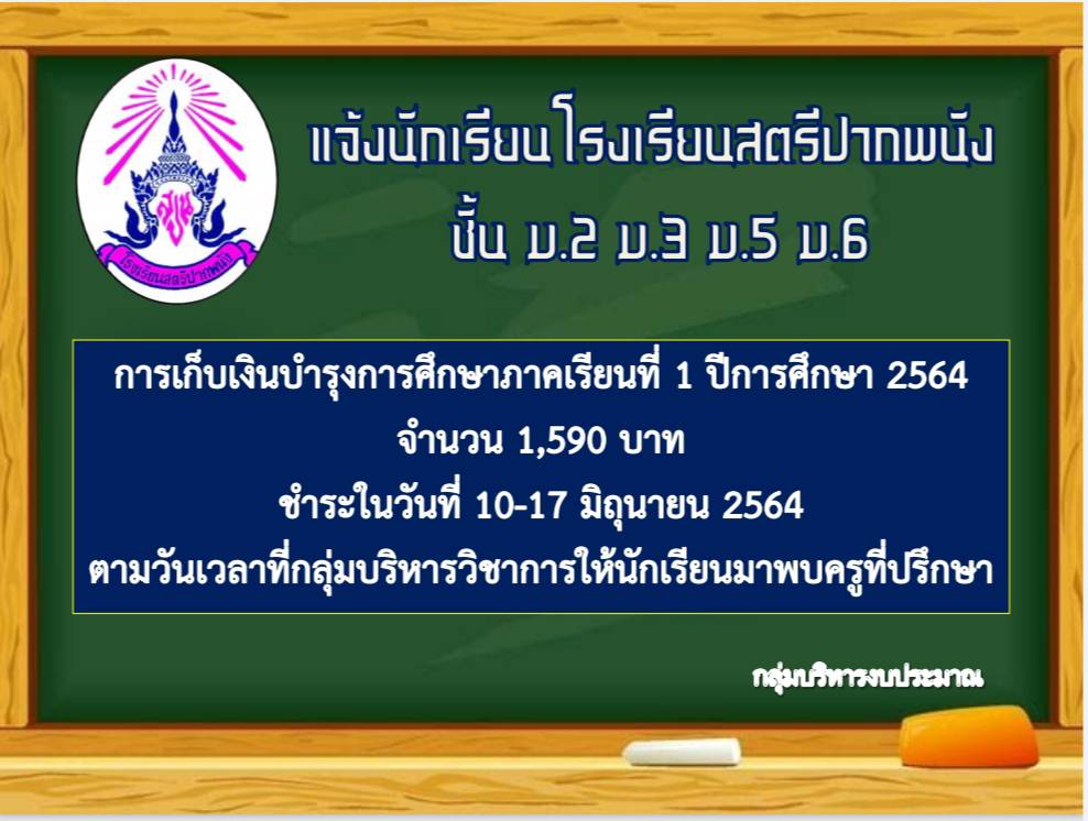 ข่าวประชาสัมพันธ์ ประกาศจากโรงเรียนสตรีปากพนังเรื่อง เก็บเงินบำรุงการศึกษาภาคเรียนที่ 1 ปีการศึกษา 2564 (ม.2 ม.3 ม.5 ม.6) 28 พฤษภาคม 2021 คุณวุฒิ สุขพิทักษ์